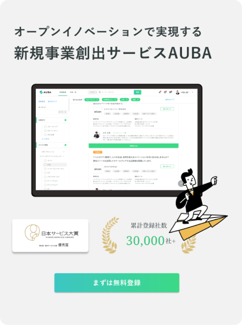 AUBAは、日本最大級のオープンイノベーションプラットフォーム。 大企業から中小・スタートアップ、自治体まで累計登録数は3万4,000社以上、サクセスケースは1,700以上を誇り、業界最大級の実績を生み出しています。事業創出のためのコンセプトメイクからPR、企業とのマッチング、進捗管理といった機能を搭載。さらに、イノベーションアドバイザーによるハンズオン支援も用意しており、意図的に事業を創出するための仕組みをALL IN ONEで提供しています。 無料で登録する